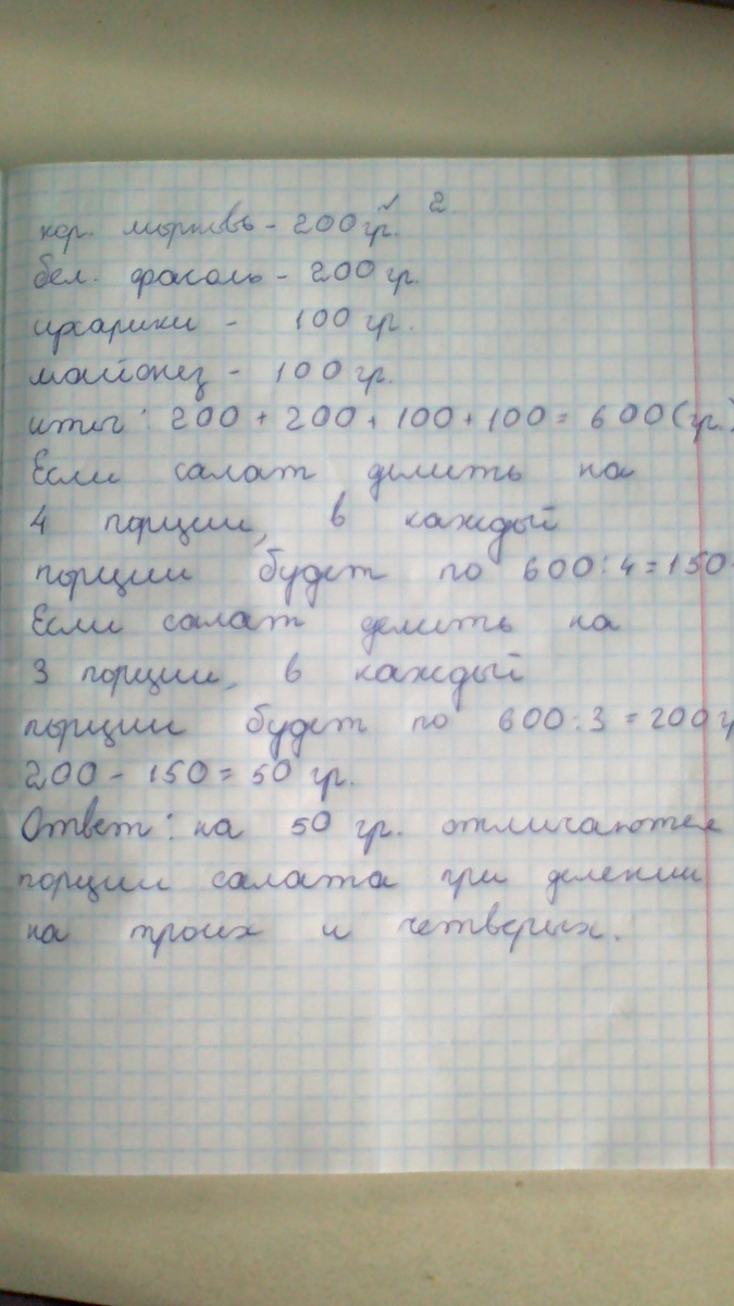 Задание: на сколько граммов отличаются порции салата при делении на троих и четверых?