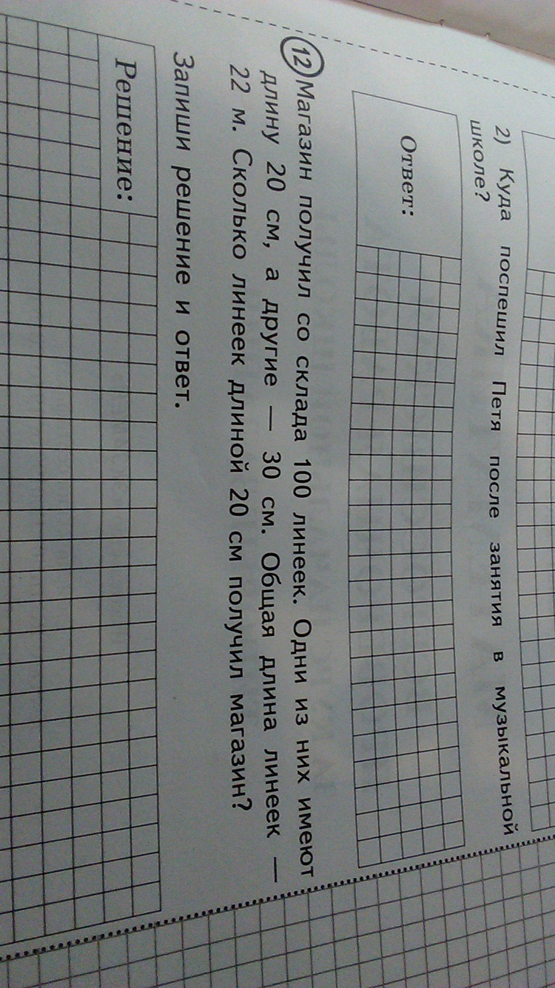 4)200:10=20лин.по 30 см,тогда5)100-20= 80 лин.по 20см,делаем проверку:20*80+30*20=1600+600=2200см= 22 м длина всех линеек,задача решена верно.