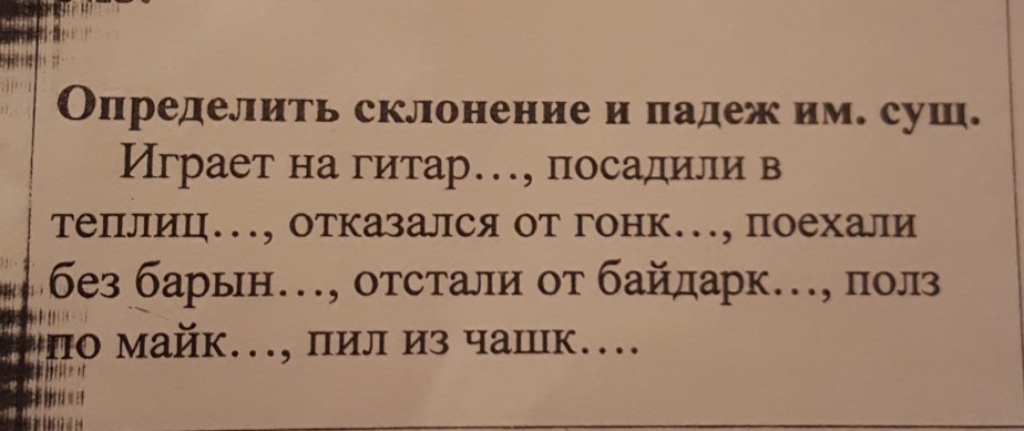 играет на гитаре,посадили в теплице,отказался от гонки,поехали без барыни,отстали от байдарки,полз по майке,пил из чашки. гитаре-1 скл,1спр, теплице-1скл,1спр, гонки-1скл,2спр, барыни-1скл,2спр, байдарки-1скл,2спр, майке-1скл,1спр, чашки-1скл,2спр.