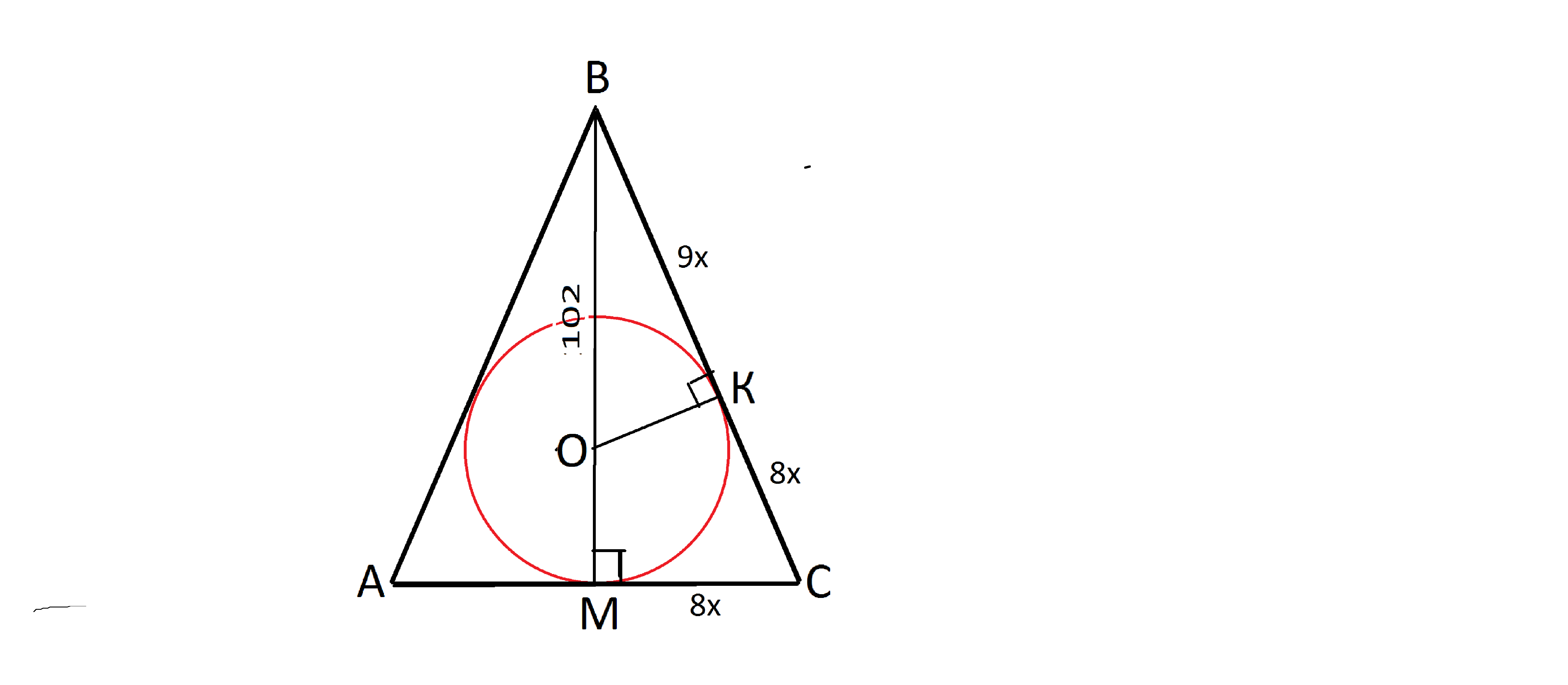 у рівнобедрений трикутник вписано коло,центр якого віддалений від вершини трикутника на 102 см,а точка дотику ділить бічну сторону на відрізки,довжини яких відносяться як 8:9,рахуючи від кута при основі.Знайдіть площу цього трикутника.