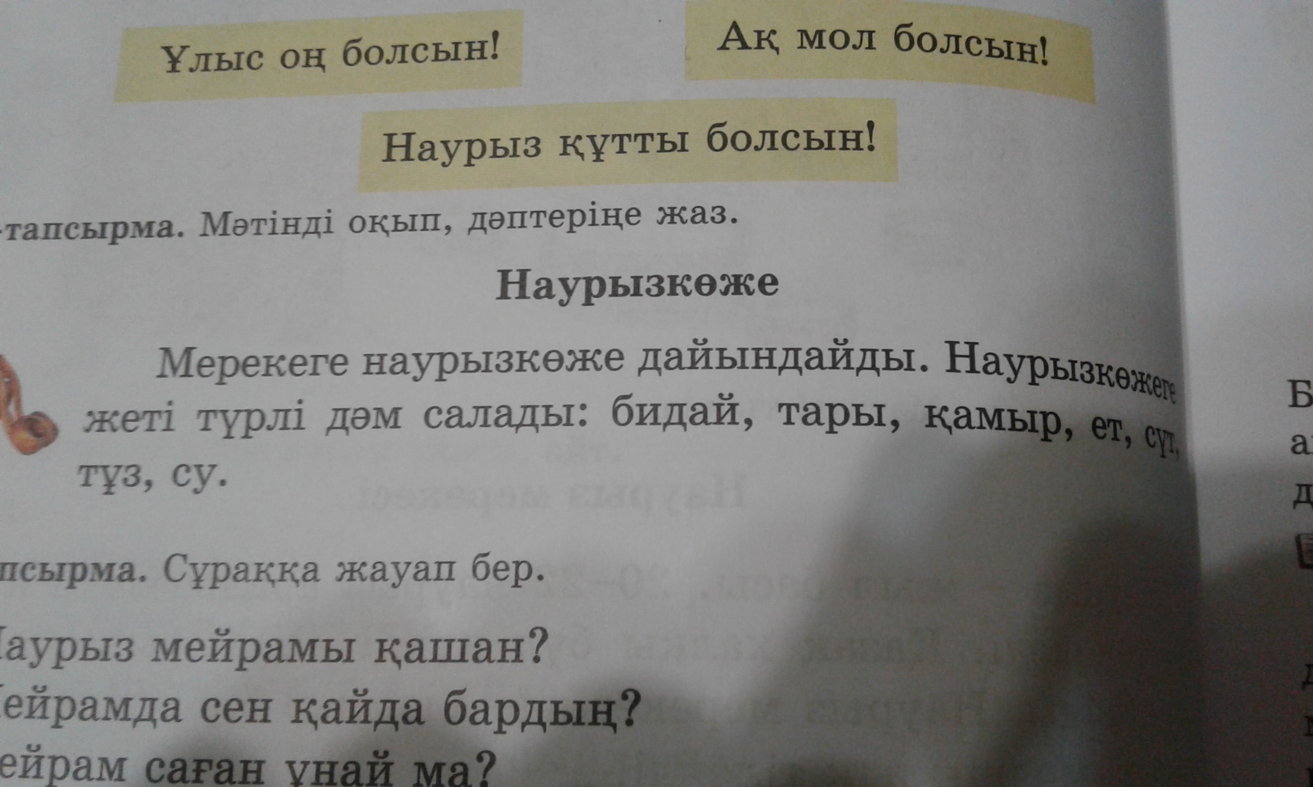 на праздники готовят наурыз коже. В наурыз коже входят 7 разных ингридиентов:пшеница, пшено , тесто , мясо , молоко , соль, вода