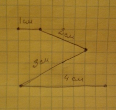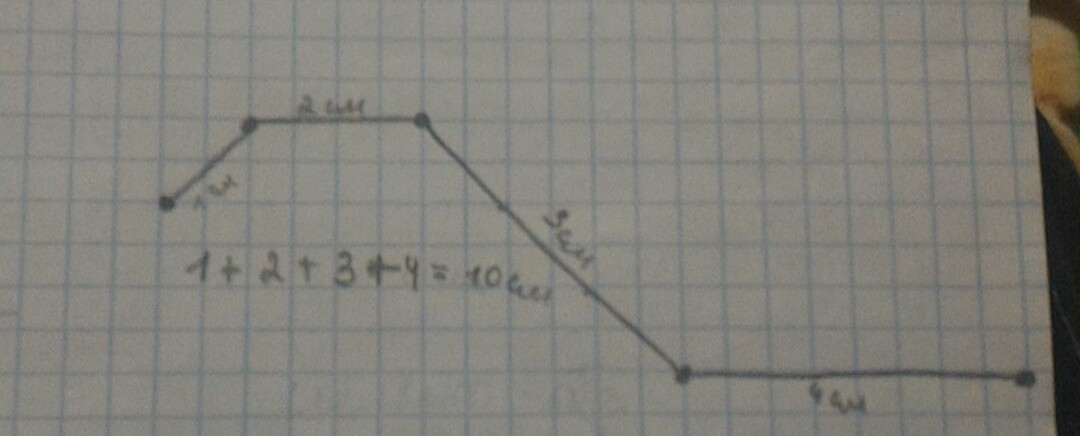 Построй ломаную из 4 звеньев , длина первого звена которой 1 см, а каждое следующее звено на 1 см длиннее предыдущего. Найди длину ломаной.