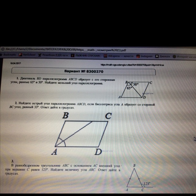 В первом задании,наименьший угол равен 65 градусам, т.к. сумма двух углов в параллелограмме взятых с каждой стороны равна 180 градусам, ==> что угол ВАD=180-115=65'