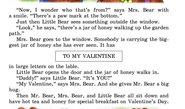 «Сегодня День Святого Валентина, - говорит однажды утром миссис Медведь, - я знаю, - говорит Маленький Медведь. - Почтовый работник принес вам карточку. У этого есть сердце на конверте. "Г-жа Медведь открывает это сразу и читает это вслух: