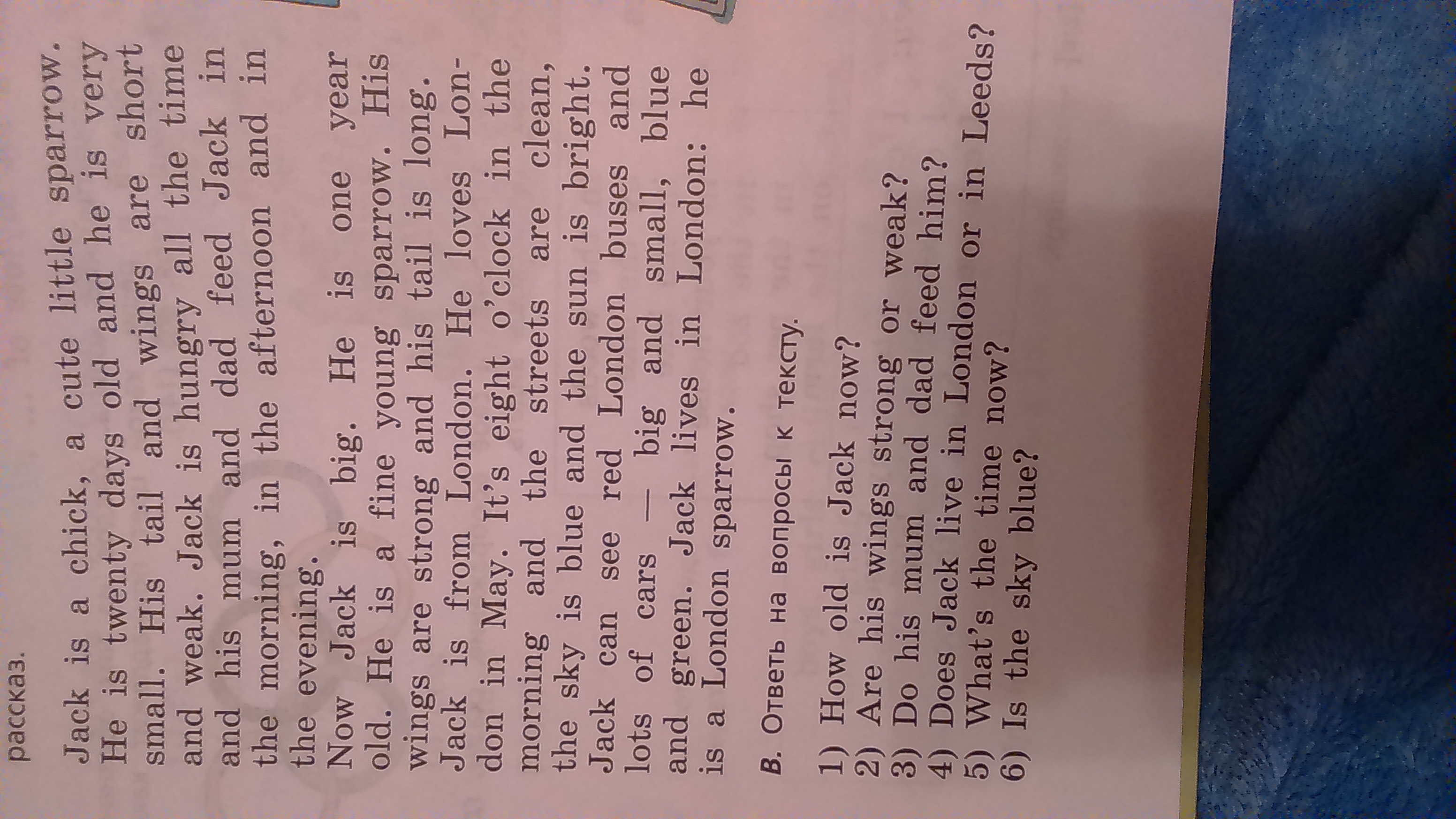 Джек птинец, милый маленький воробей. Ему двадцать дней, и он очень маленький. Его хвост и крылья маленькие и слабые. Джек голоден все время, а его мама кормит Джека ДНЁМ и вечером. Теперь Джек большой. Ему один год . Он прекрасный молодой воробей . У него крупкие крылья, хвост длинный , Джек из - Лондона. Он любит Лон Дон в мае. Сейчас восемь часа утра , улицы чисты , небо синее , солнце яркое . Можно увидеть красивые Лондонские автобусы и множество автомобилей больших и малых , синих и зелёных. Джек живет в Лондоне он Лондонский воробей. 1) Сколько лет Джеку сейчас ? . 2) Являютсяли крылья сильными или слабыми ? . 3) кормят ли его мама и папа ? . 4) Живет ли Джек в Лондоне или в Лидеры ? 5) Сколько сейчас времени?. 6) Небесно - голубой ? [ была рада вам помочь надеюсь вы оцените мои старание сердечком буду рада в дольше ешё вам помогать .! ] [ если хотите получать от меня помощь в дольнейшем можете подписаться на меня если хотите и я могу вам помогать !!!]