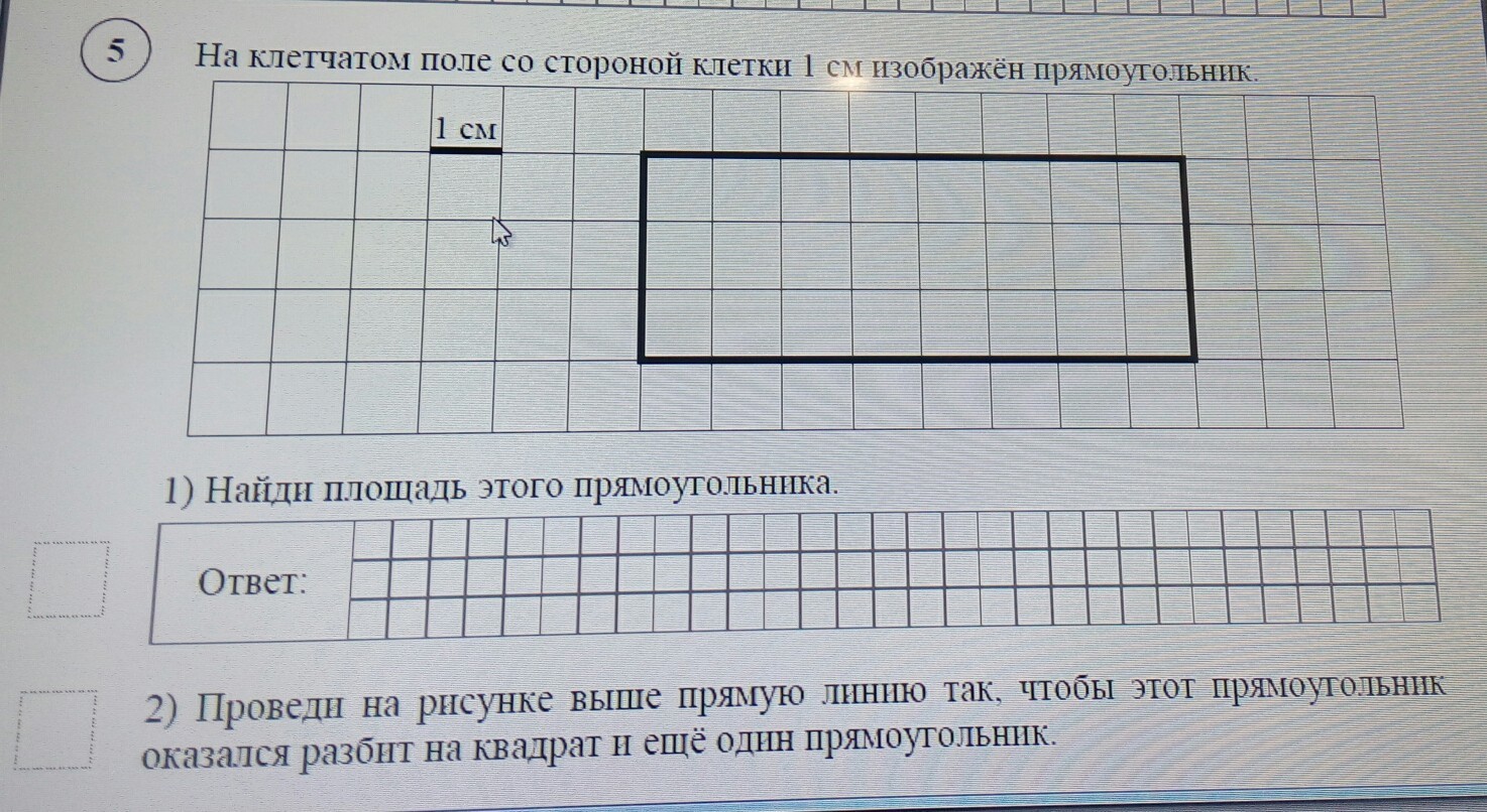 на клетчатом поле со стороной клетки 1 см изображён прямоугольник.1)найди площадь этого прямоугольника.2)проведи на рисунке выше прямую линию так, чтобы этот прямоугольник оказался разбит на квадрат и ещё один прямоугольник
