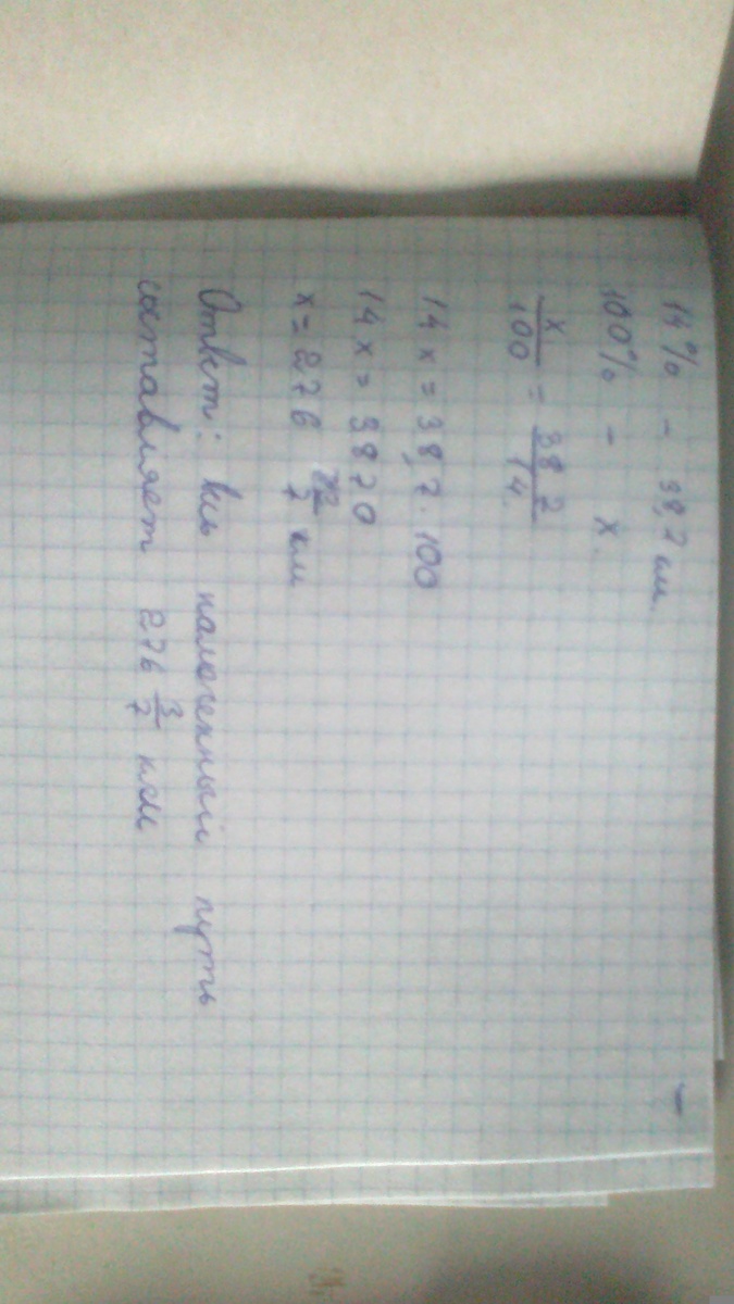 В первый день туристы преодолели 38,7 км,что составляет 14 процентов всего пути!сколько километров составляет весь намеченный путь?решите плиз,заранее спасибо)очень срочно надо!))(