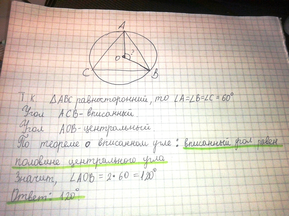В окружность с центром О вписан равносторонний треугольник. Найдите градусную меру угла АОВ. Объясните как это решать плиииз