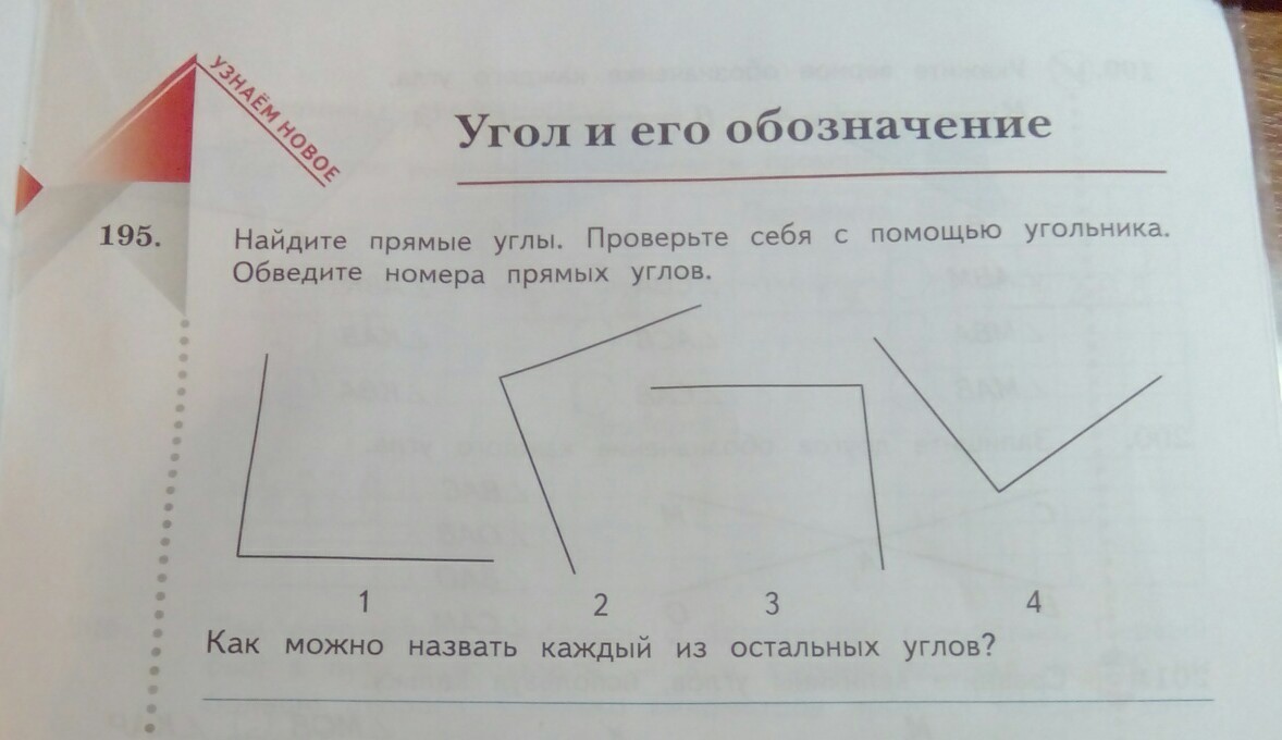 Найдите прямые углы. Проверьте себя с помощью угольника.(у меня его нету) Обведите номера прямых углов.