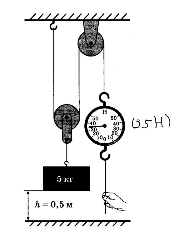 Но в данный момент нам не известна работа⇒ значит формула будет выглядеть так: η=mg/2F *100% Получаем η=5кг×9,8Н/кг /2×35Н ×100%= 49Н/ 70Н ×100%=4900/70=70%