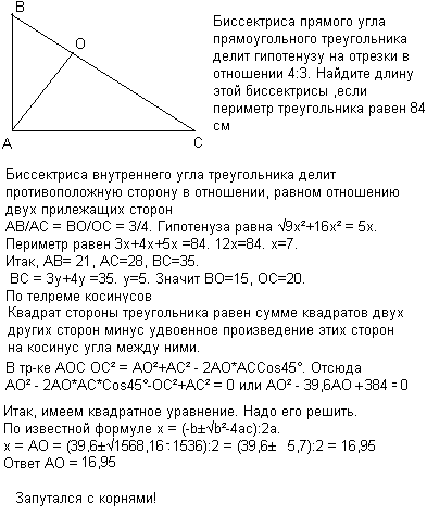 Биссектриса прямого угла прямоугольного треугольника делит гипотенузу на отрезки в отношении 4:3. Найдите длину этой биссектрисы ,если периметр треугольника равен 84 см. Помогите пожалуйста) мне по этому рисунку