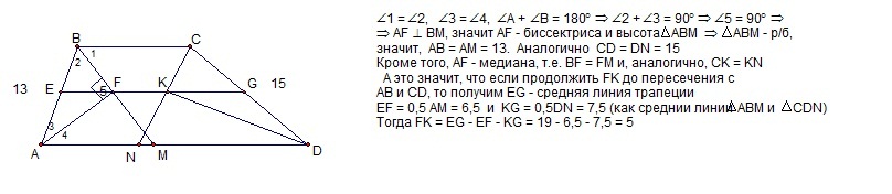 биссектрисы углов a и b при боковой стороне ab трапеции abcd пересекаются в точке f. биссектрисы углов c и d при боковой стороне cd пересекаются в точке g. найдите fg, если средняя линия трапеции равна 21, боковые стороны-13 и 15.
