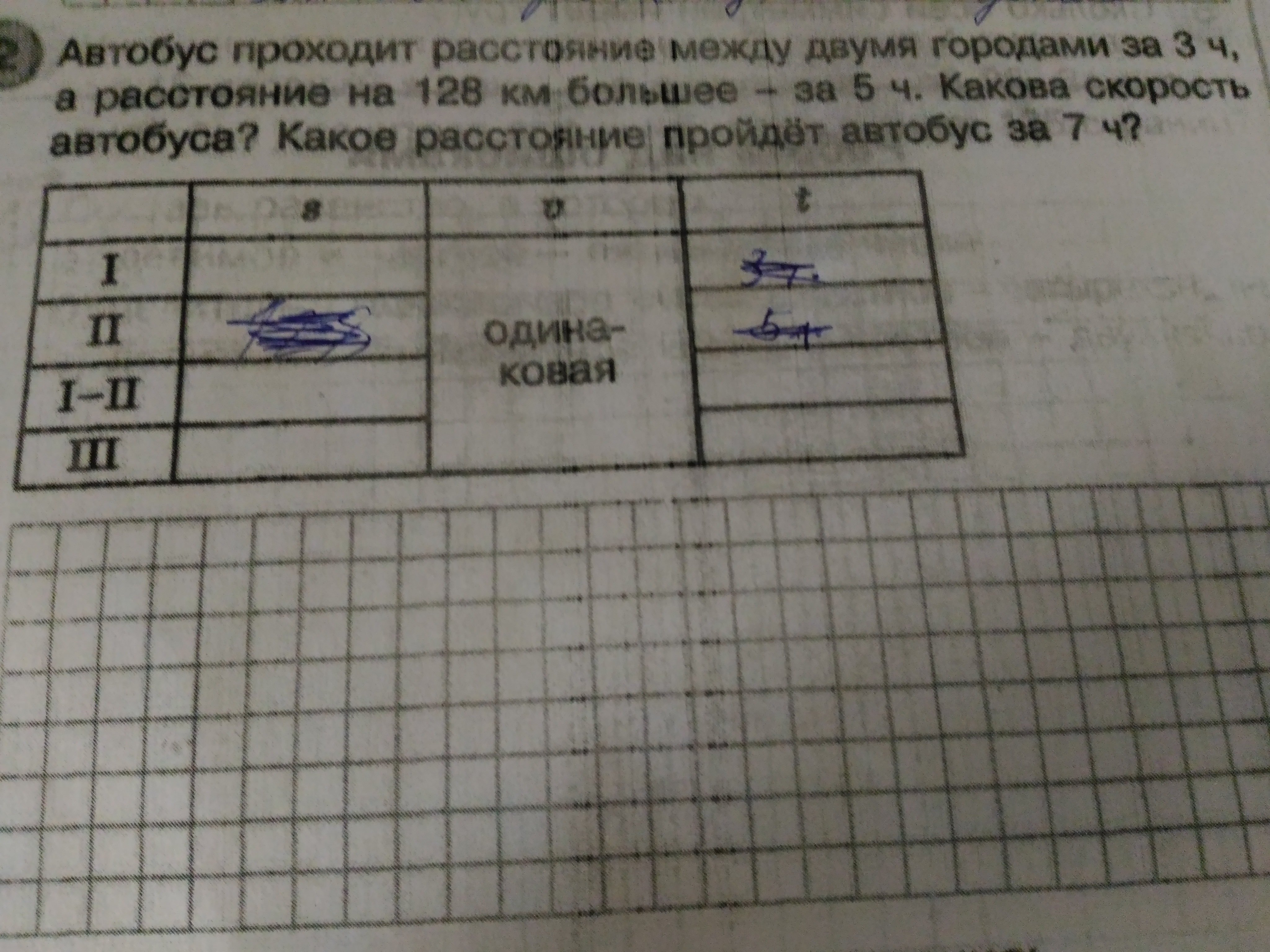 схема к задаче: автобус проходит расстояние между двумя городами за 3 часа расстояние на 128 км больше за 5 часов Какова скорость автобуса ?какое расстояние пройдет автобус на 7 часов?