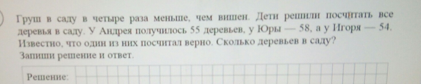 груш в саду в четыре раза меньше чем вишен. Дети решили посчитать все деревья в саду. У Юры 58, а у Игоря 54, ну а у Андрея 55. Сколько деревьев в саду? пожалуйста!!!