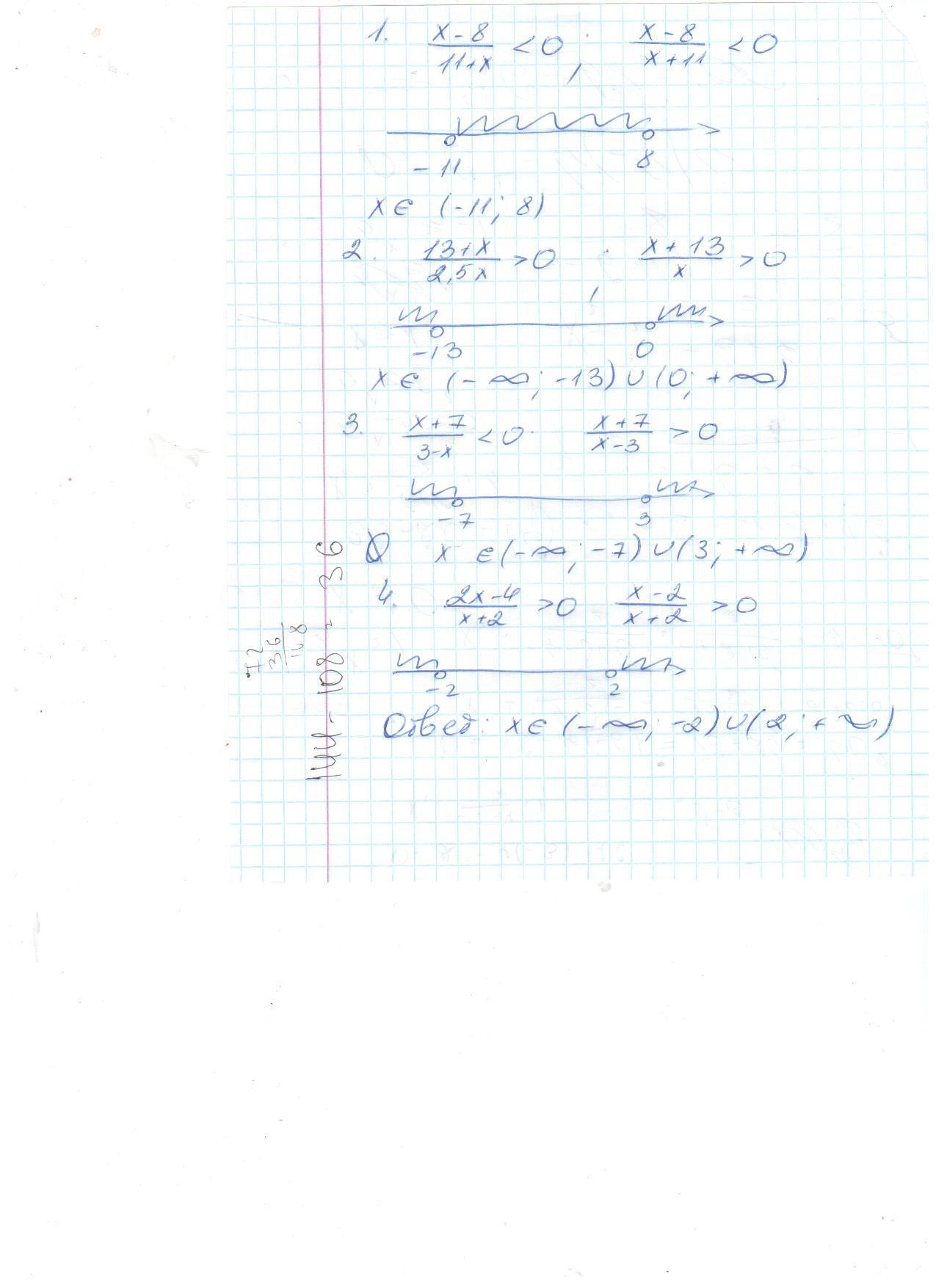 решите неравенства 1) х-8/11+х <0 2) 13+х/2,5х>0 3) х+7/3-х <0 4) 2х-4/х+2>0 пожалуйста решите все и подробно с чертижом пажалуйста решите до 11:00 или 12:00 пожалуйста
