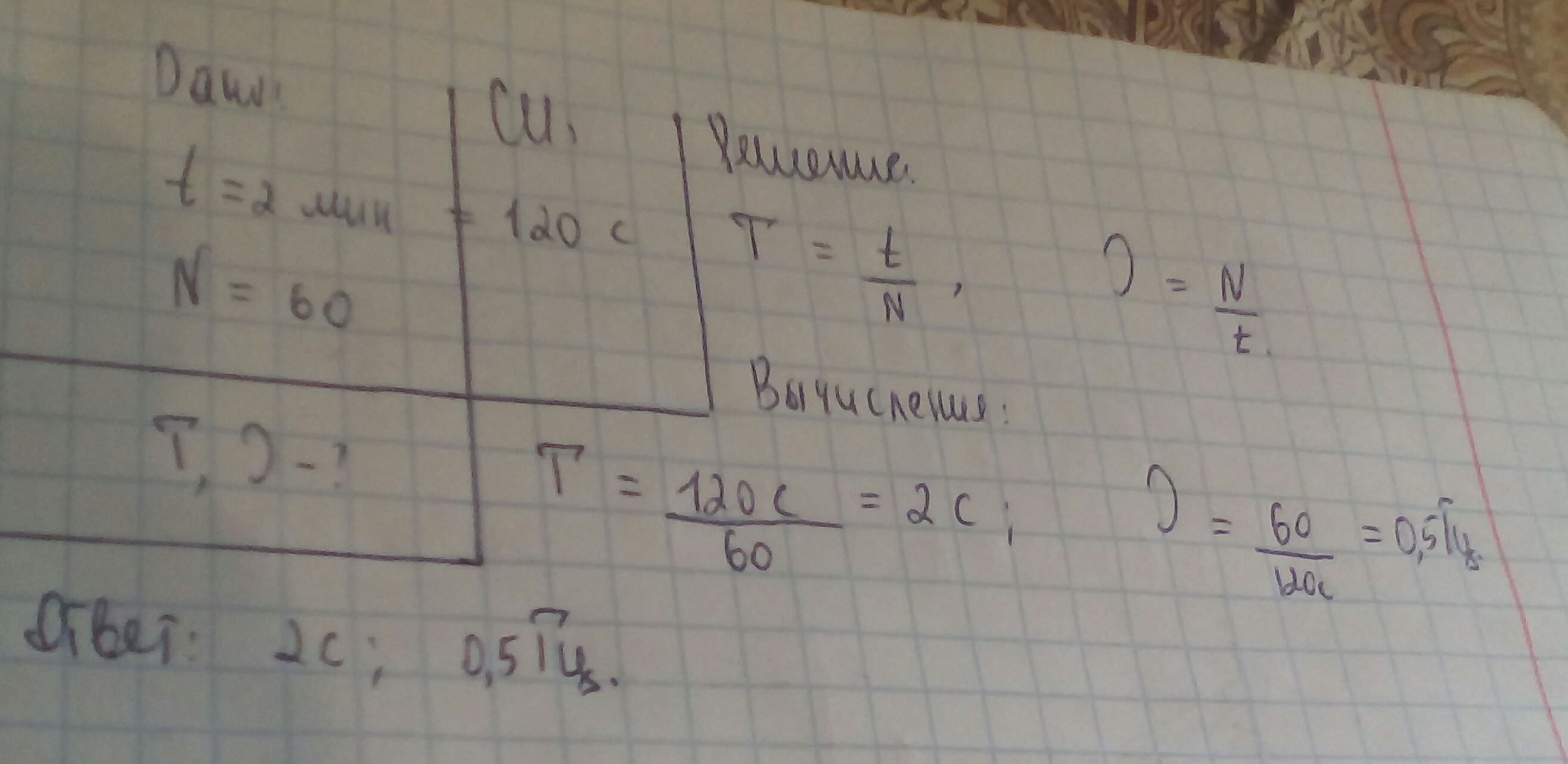 Вася заметил, что ворона в течение 2 минуты каркнула 60 раз. Определите период и частоту колебаний