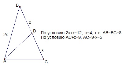 Медиана равнобренного треугольника делит его периметр на части,равные 12см и 9см .найти стороны треугольник(пожалуйста с небольшим обьяснением ,то не пойму чегото)
