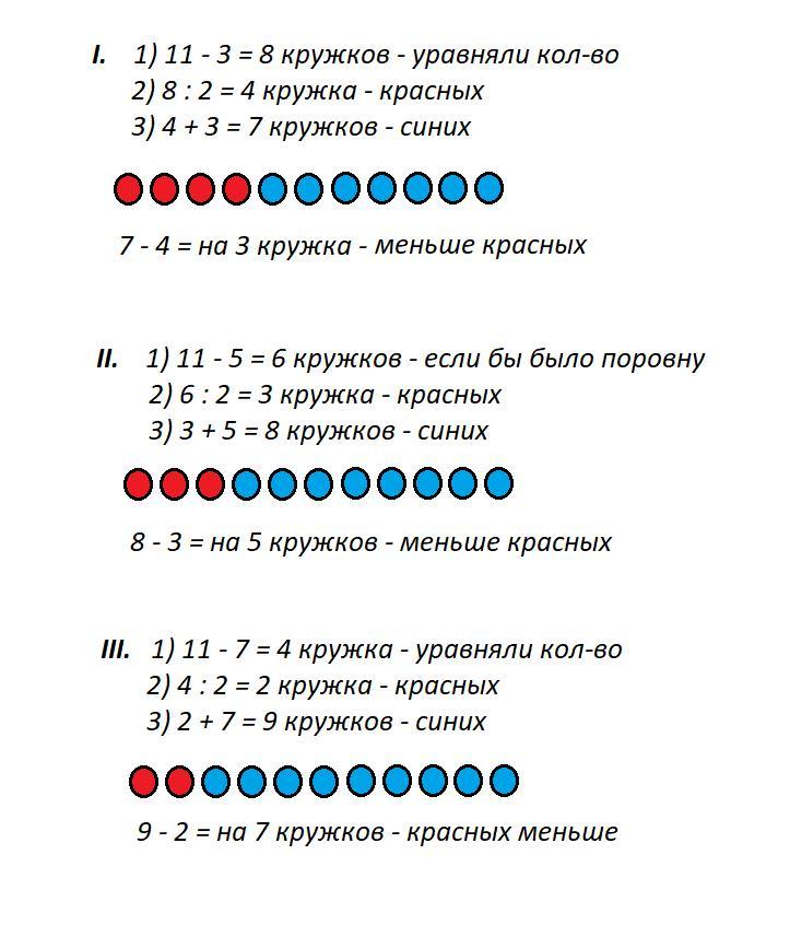 На каждом рисунке по 11 кружков. Раскрась каждый рисунок красным и синим карандашами так, чтобы красных кружков стало меньше, чем синих: на рисунке 1- на 3 кружка, на рисунке 2- на 5 кружков, на рисунке 3- на 7 кружков.