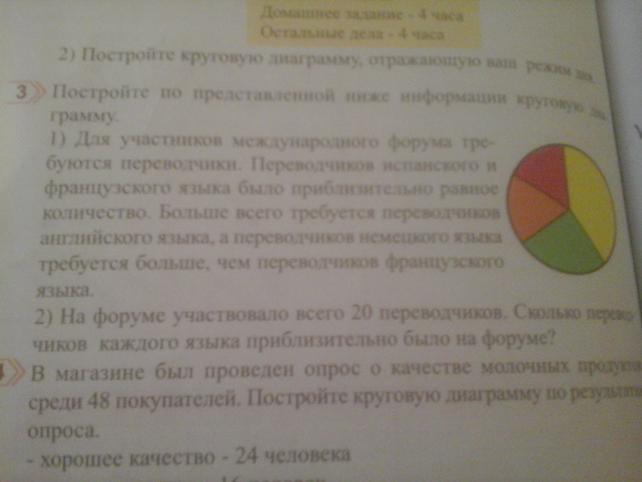 красный и оранжевый приблизительно 60 градусов занимают. Проверим. 18*3=54 (градуса). Подходит. Значит, испанцев и французов по 3 человека. Остаются немецкие переводчики 360-(54*2+162)= 90 (градусов) круга занимают немецкие переводчики. 90:18=5 (человек)