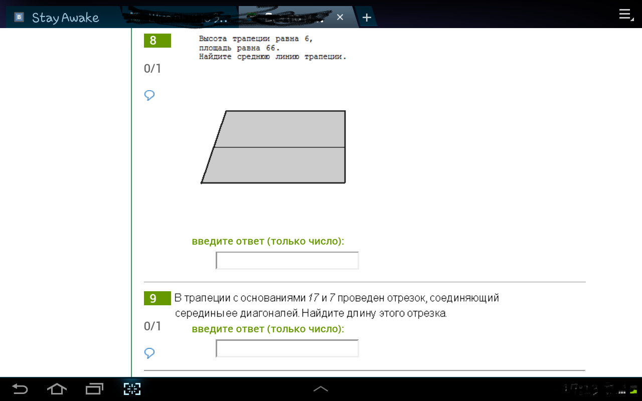 8)Площадь трапеции равна средней линии, умнодъженной на высоту. отсюда средняя линия равна 11.
