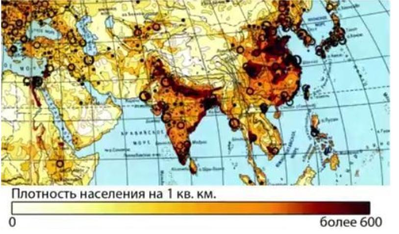 Отсюда следует такой вывод:территории с максимальной плотностью населения расположены в тёплых климатических поясах с мягким климатом и достаточной влажностью, недалеко от морей и океанов, с равнинным рельефом и плодородными землями.