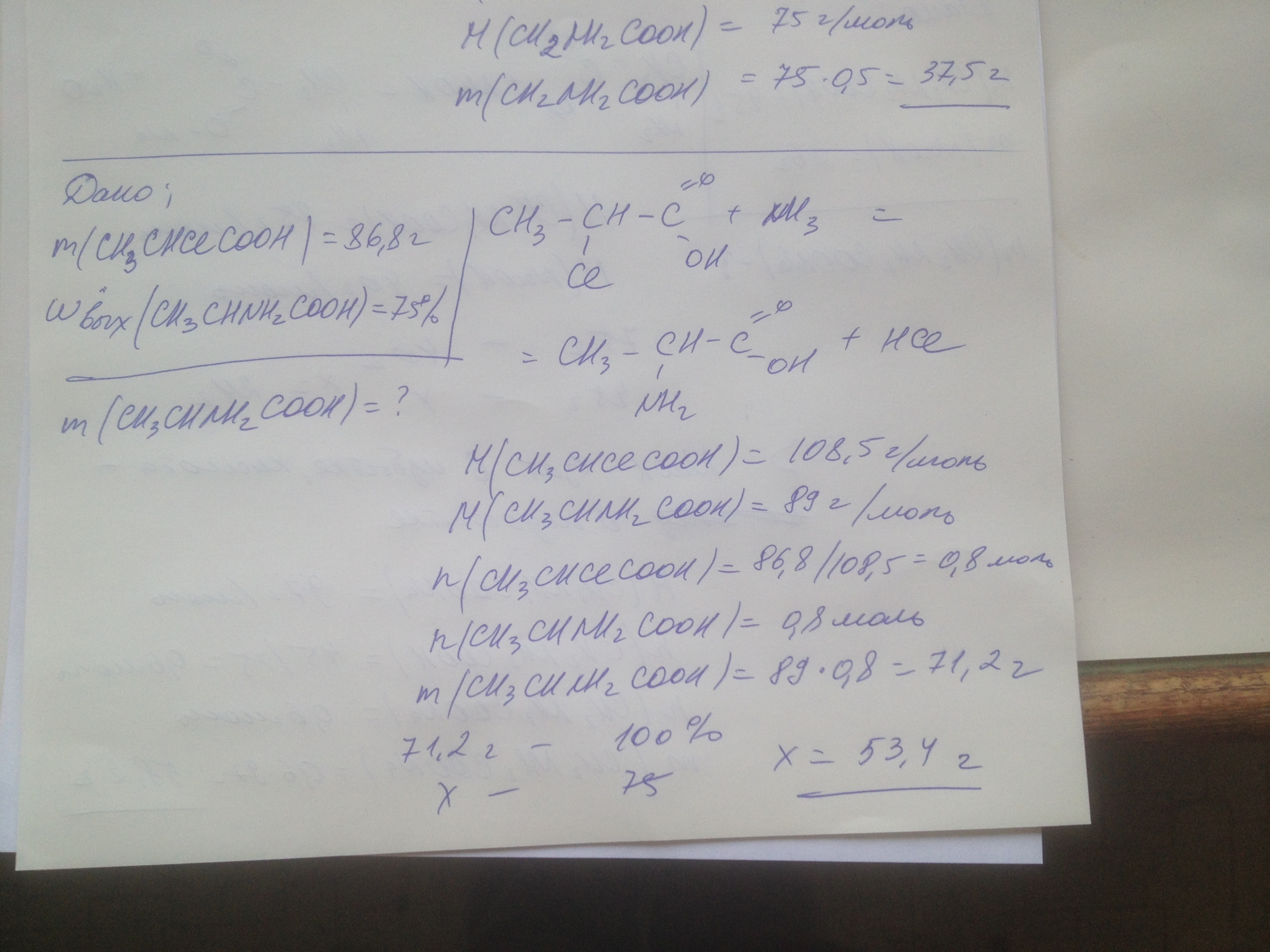 Чему равна масса 2-аминопропановой кислоты, которую можно получить при взаимодействии 86,8 г 2-хлорпропановой кислоты с избытком аммиака, если выход продукта составляет 75%?
