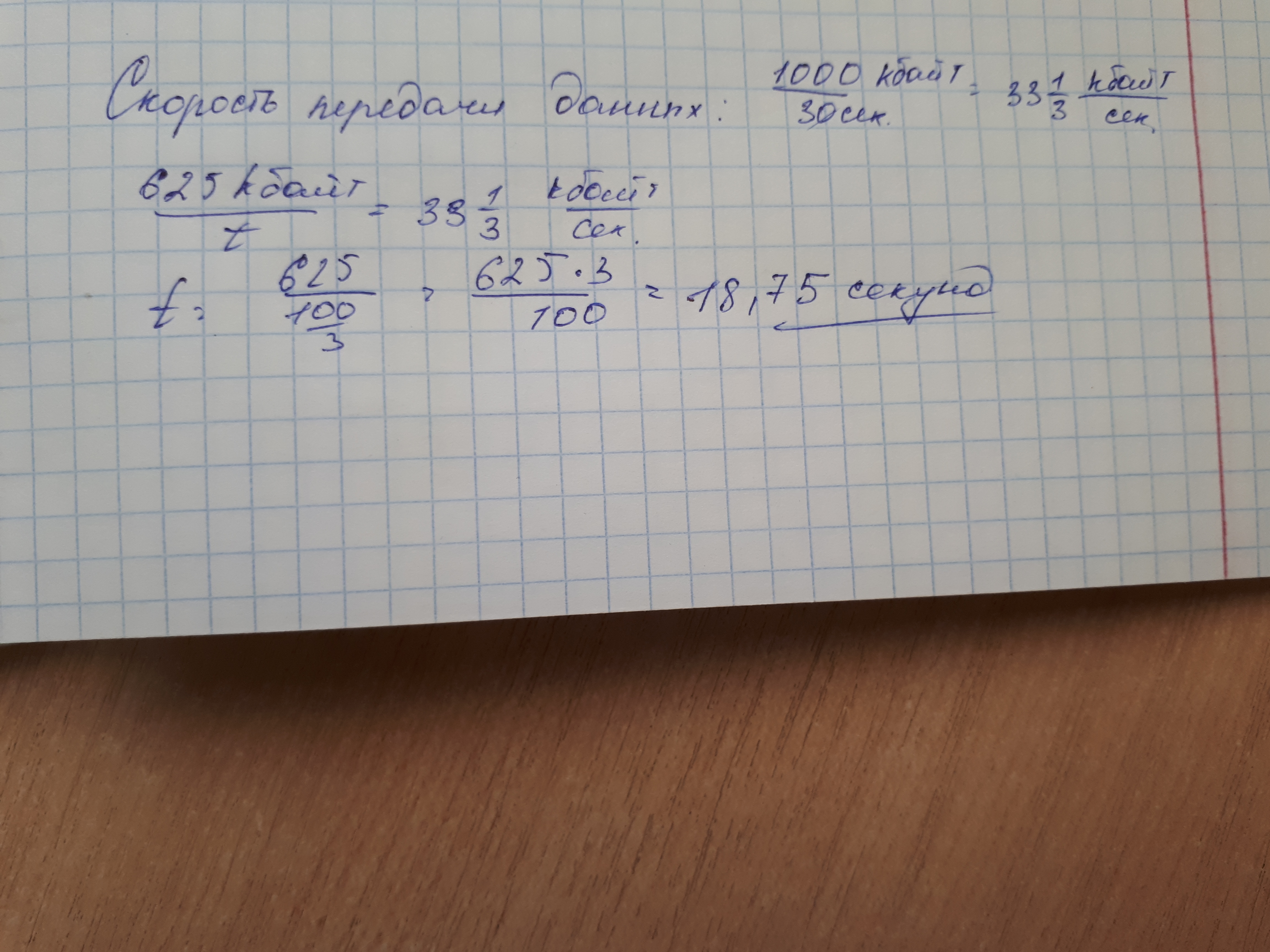 Через ADSL- соединение файл размером 1000 кбайт передавался 30 сек. Сколько потребуется секунд для передачи файла размером 625 Кбайт