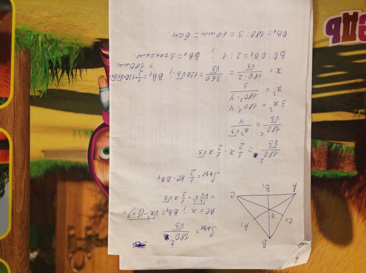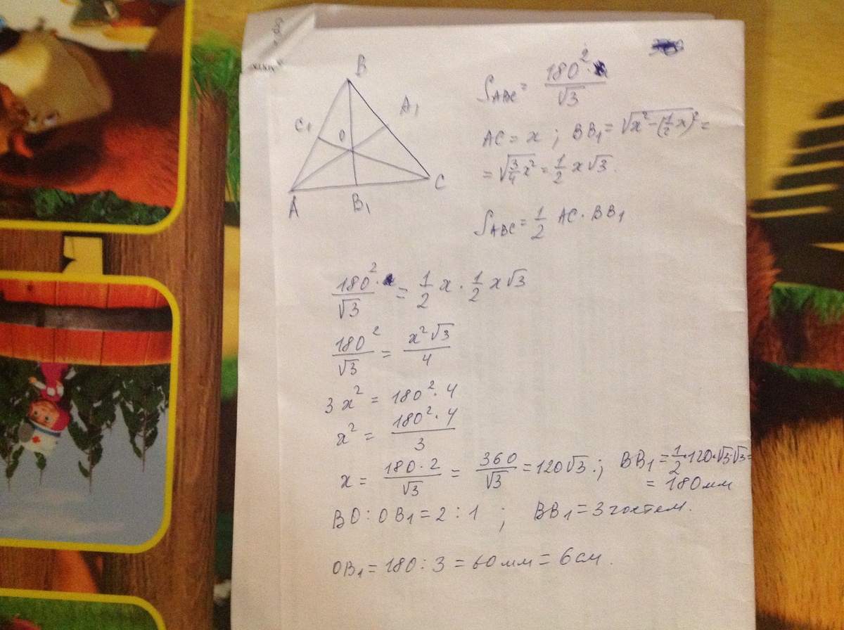 В равностороннем треугольнике ABC медианы AA1,BB1 и CC1 пересекаются в точке O.Зная,что Sabc=180^2/√3 мм^2,найдите длины OA1,OБ1,OC1