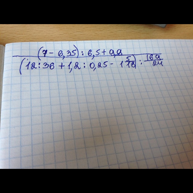 1) 7 - 6.35 = 0.65.2) 0.65/6.5 = 0.13) 0.1 + 9.9 = 104) 12/36 = 1/35)1.2 / 0.25 = 4.8 = 4 4/56)1/3 + 4 4/5 = 5 2/157) 5 2/15 - 1 5/16 = 3 197/ 2408) 3 197/ 240 / 24/169 = 917 / 1960 9)10 / 917/1960 = 21 343/ 917.
