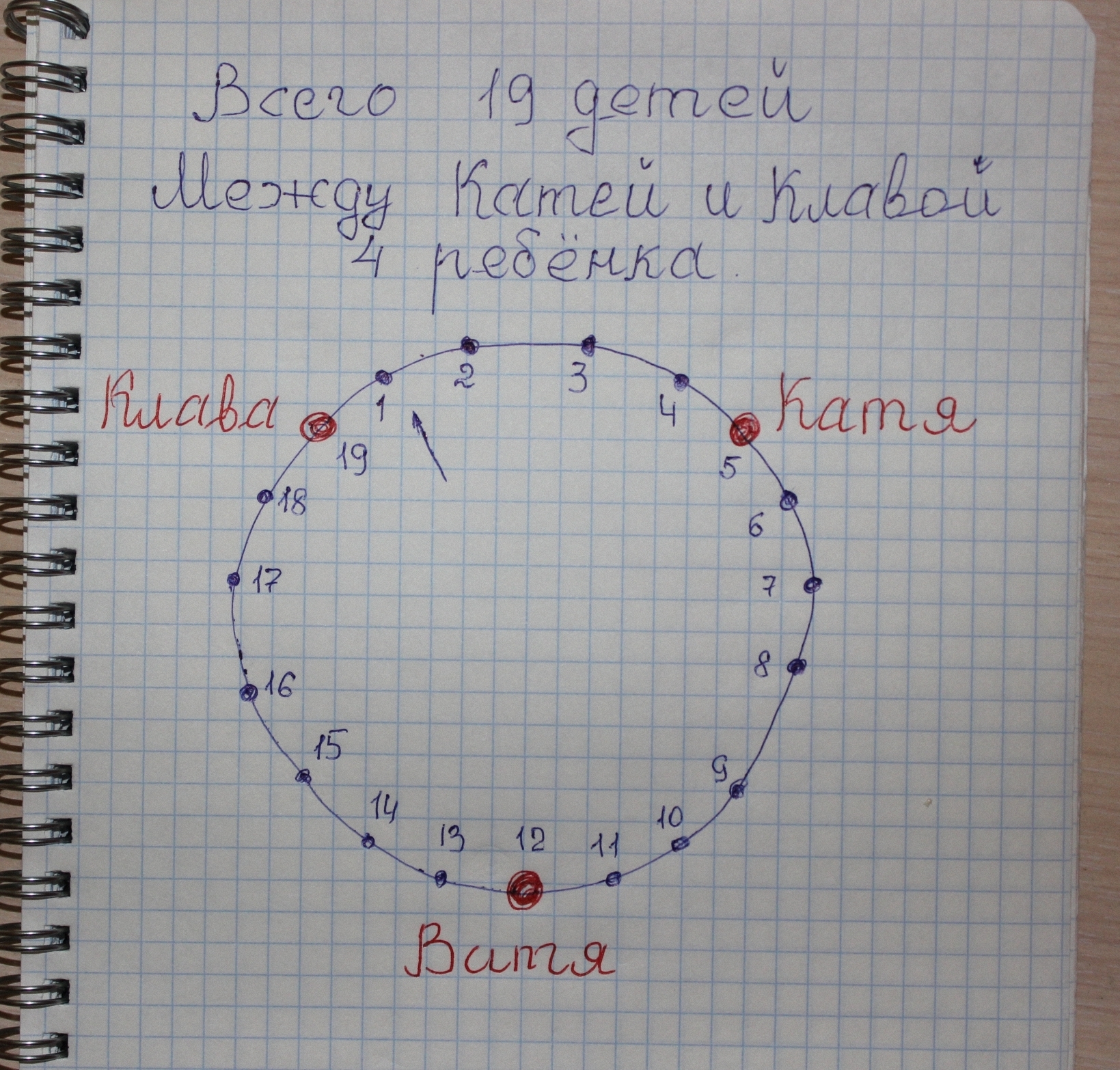 Ответ: всего 19 детей; между Клавой и Катей с одной стороны 4 детей, с другой 13.