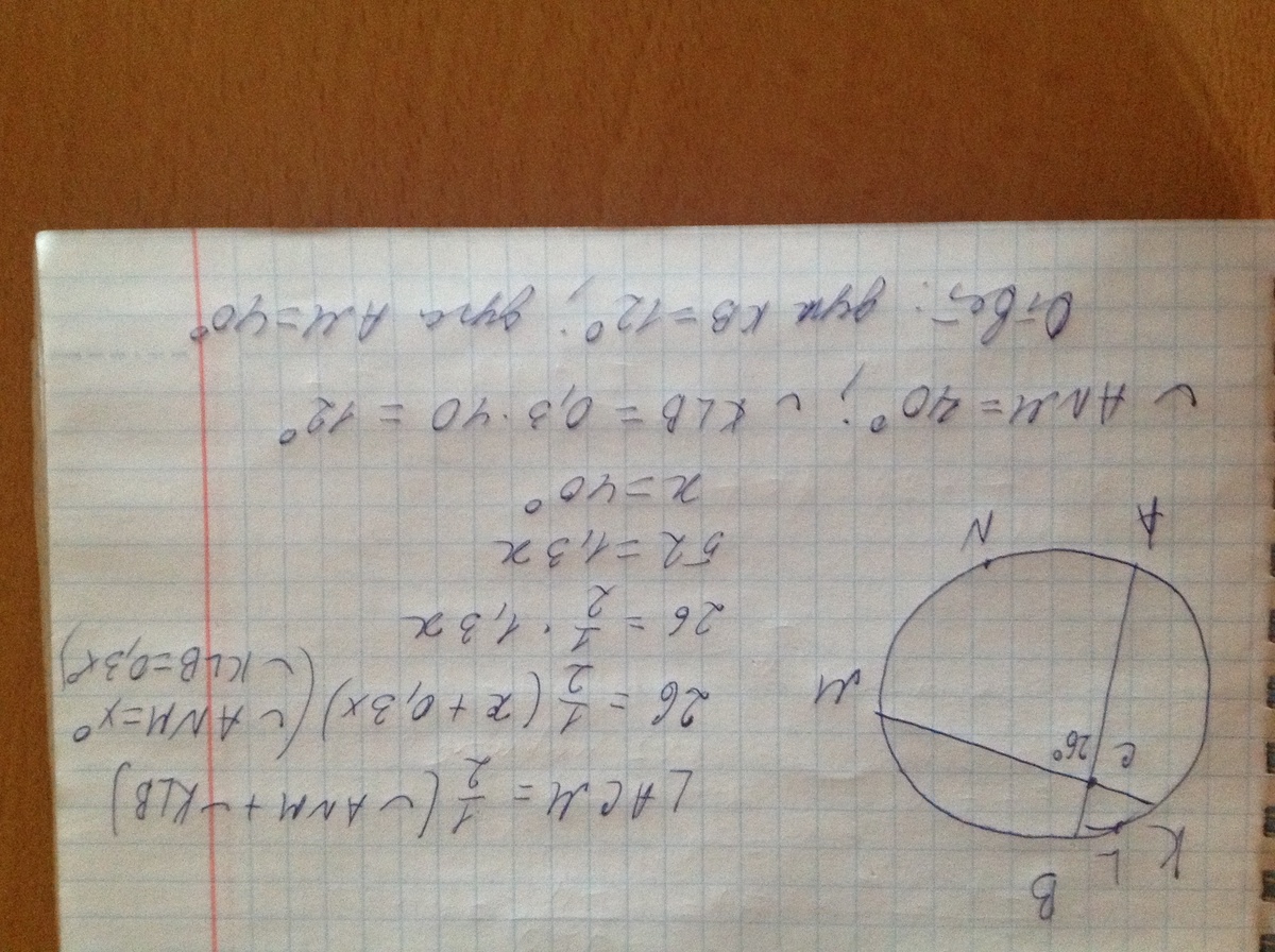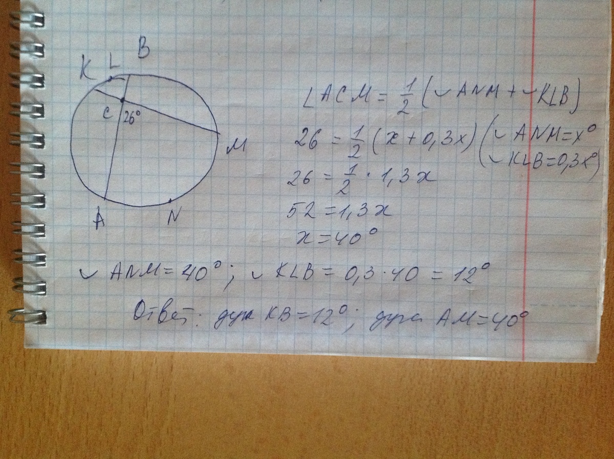 Угол АСМ равен 26˚, а дуга КВ составляет 30% дуги АМ. Найдите дуги КВ и АМ.