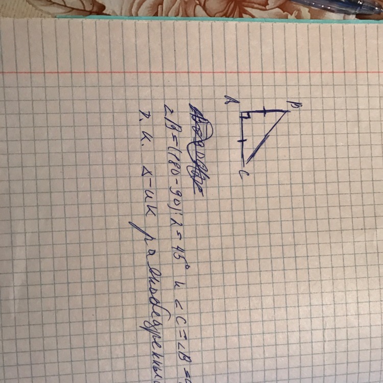 Так как треугольник равнобедренный то углы при основании равны отсюда вывод что угол B и угол C равны (180-90):2=45* Легкая задача пора бы и самим решать