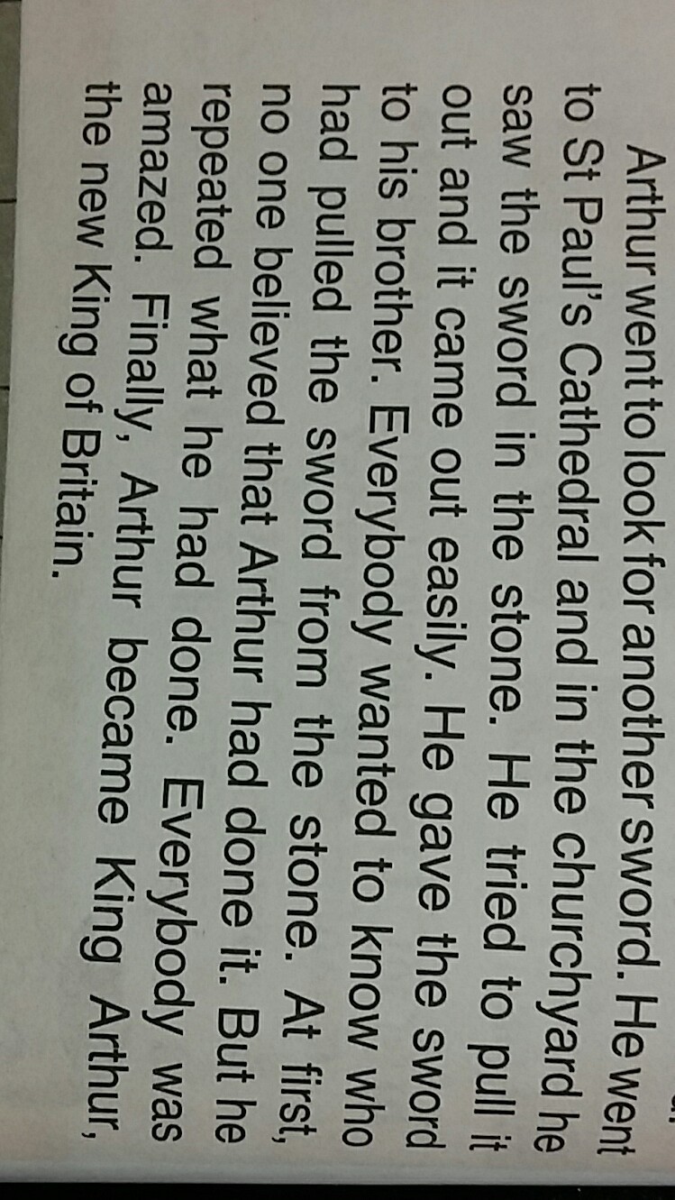Артур пошел искать другой меч. Он отправился в собор Святого Павла, и на кладбище увидел меч в камне. Он попытался вытащить его, и он вышел легко. Он отдал меч своему брату. Все хотели знать, кто вытащил меч из камня. Сначала никто не верил, что Артур сделал это. Но он повторил то, что сделал. Все были поражены. Наконец, Артур стал королем Артуром, новым Королем Британии.