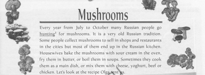 Эври еа фром джулаи ту октоба мэни рашн пипл го хантин фо машрумс. Ит из э вэри олд рашн традишн. Сам пипл колэкт машрумс ту сэл ин шопс энд ресторанс ин зе ситис бат мост оф зэм енд ап ин зэ рашн кичен. Хаусвайвс бэйк зэ машрумс виз соа крим ин зе оувэн, фрай зэм ин бата, о боил зэм ин супс. Самтаймс зэй кук зэм эз э мэйн диш, о микс зэм виз чис, йогут, биф о чикен. Лэтс лук эт зэ ресайп Ольга сэнт аз.