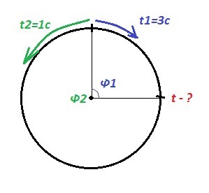 Две точки с постоянными по модулю скоростями движутся по окружности. Первая точка, двигаясь по часовой стрелке, делает один оборот за время T=3c, вторая точка, двигаясь против часовой стрелки, делает один оборот за за T=1с. Время между двумя последовательными встречами точек составляет....с.???