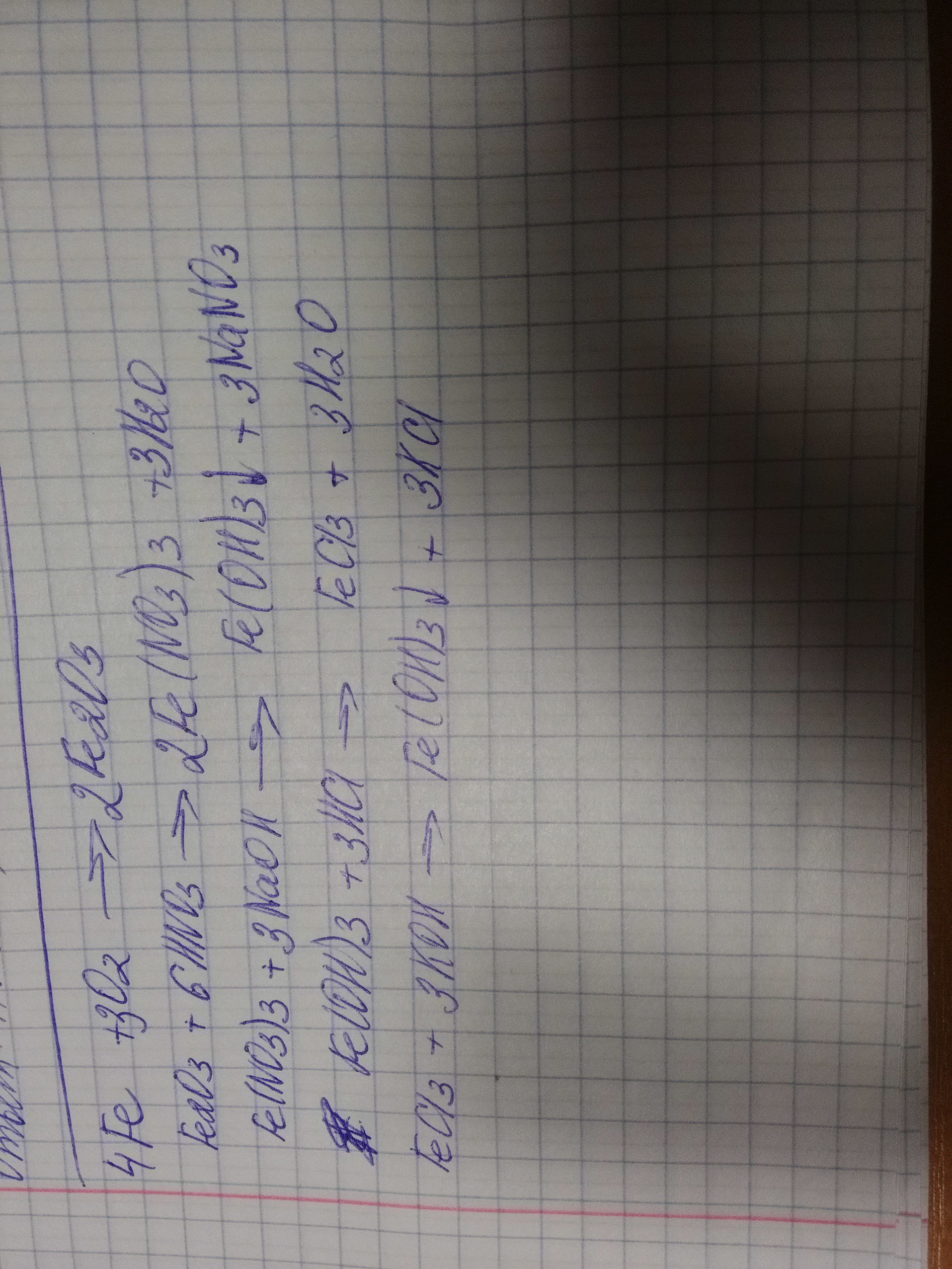 Fe->FeO3->Fe(NO3)3->Fe(OH)3->FeCl3.