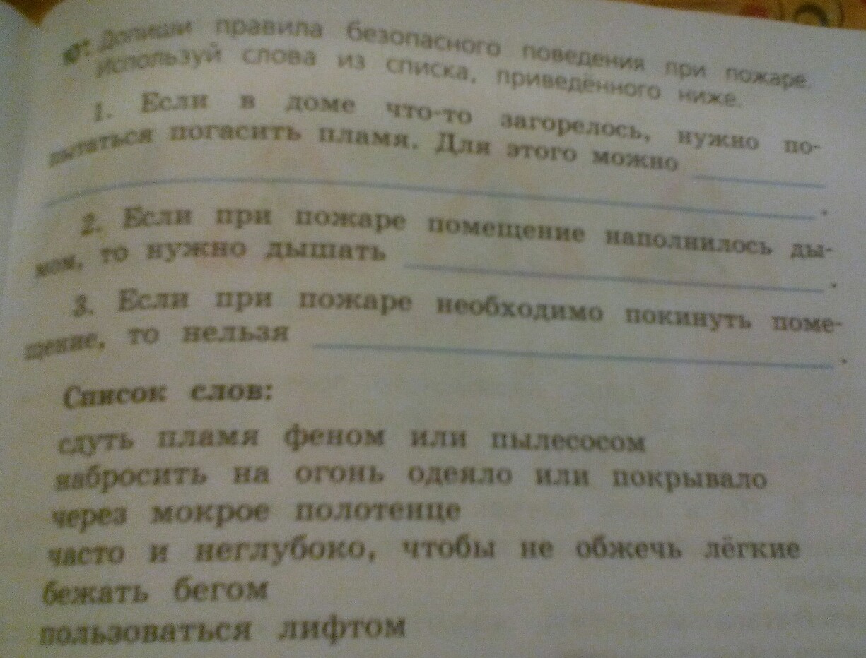 Допиши правила безопасного поведения при пожаре. Используй слова из списка, приведённого ниже