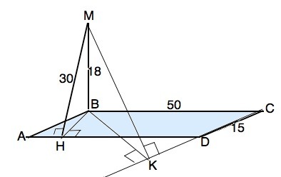 В параллелограмме ABCD стороны равны 15 и 50 см. С вершины B до плоскости параллелограмма BM установлено перпендикуляр, равный 18 см. Определите расстояние от точки M до меньшей стороны параллелограмма, если расстояние от точки M до большей стороны равна 30 см.