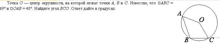 Дп радиус OB : АOB и OBC - Равнобедренные => Угол ABO = 48; угол OBC= 69-48=21 => угол BCO также = 21