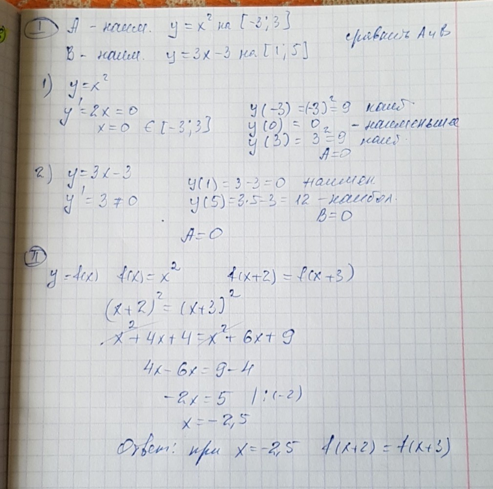 Пусть А наименьшее значение F : y = x^2 yf [- 3;3], а В наименьшее значение функции y = 3x - 3 на [1;5] что больше? A или В