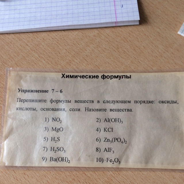 NO2(оксид азота);MgO(оксид магния);Fe2O3(оксид железа(3));H2S(сульфид водорода);H2SO3(серная кислота);Ba(OH)2(гидроксид бария);Al(OH)3(гидроксид алюминия);KCl(хлорид калия);Zn3(PO4)2(ортофосфат цинка);AlF3(трифторид алюминия);