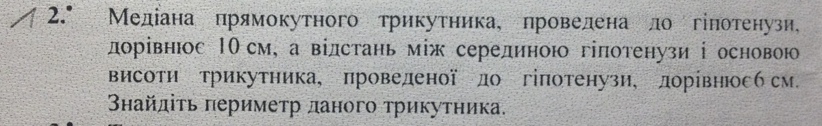 Медиана длины 10, высота и отрезок между концами высоты и медианы образуют прямоугольный треугольник. Поэтому высота равна 8. Медиана равна половине гипотенузы, поэтому гипотенуза равна 20. Если катеты a и b, то