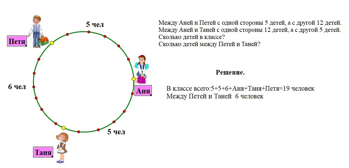 Во втором классе много детей и всех зовут по-разному. Все дети встали в круг. Между Аней и Петей с одной стороны 5 детей, а с другой 12 детей, между Аней и Таней с одной стороны 12 детей, а с другой стороны 5 детей. Сколько детей в классе? Сколько детей между Петей и Таней?