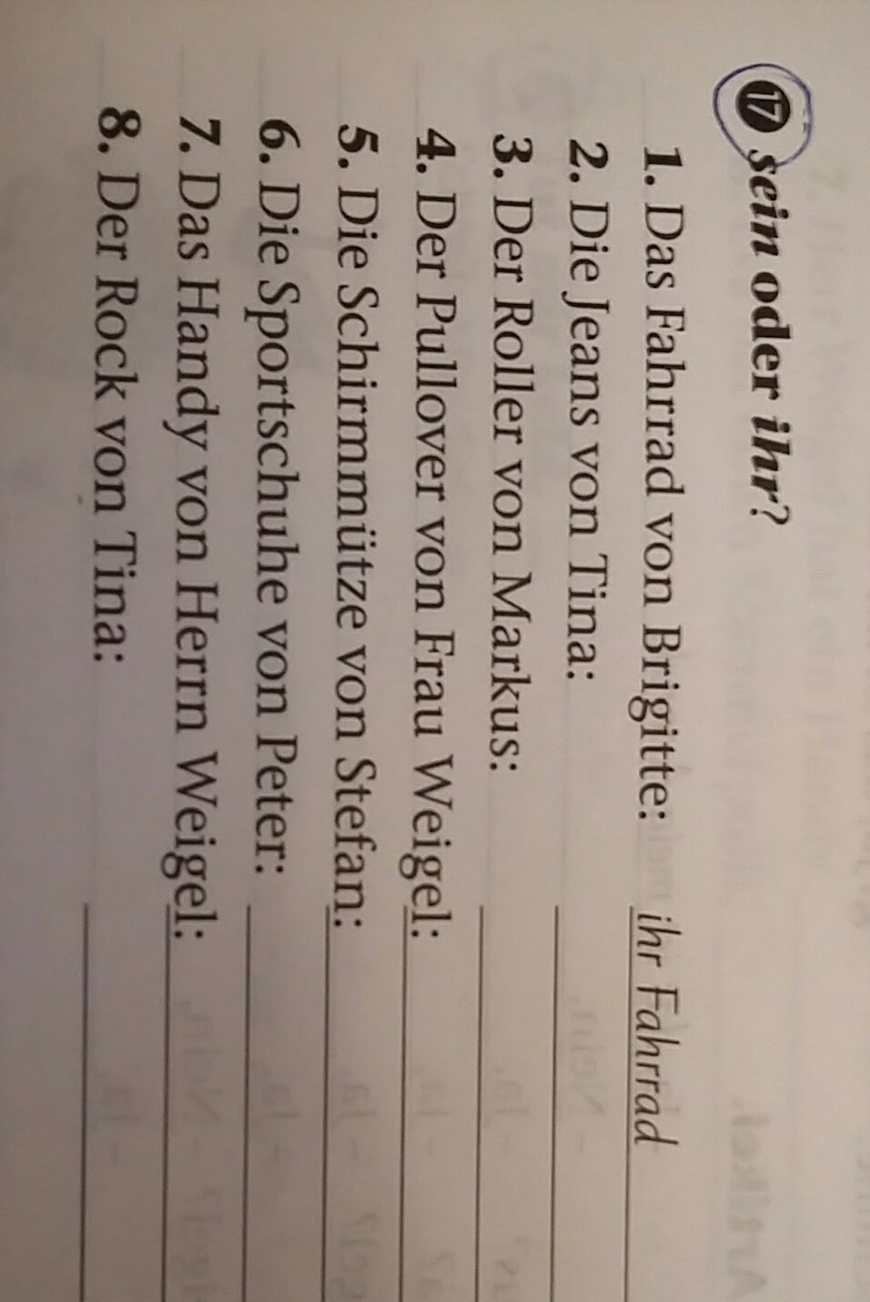 2. ihre Jens 3.sein Roller 4.ihr Pullover 5.seine Schirmmütze 6.seine Sportschuhe 7.sein Handy 8.ihr Rock
