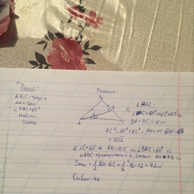 Найдите площадь равнобедренного треугольника,если высота, проведенная к боковой стороне, равна 12см, а угол при основании равен 60°
