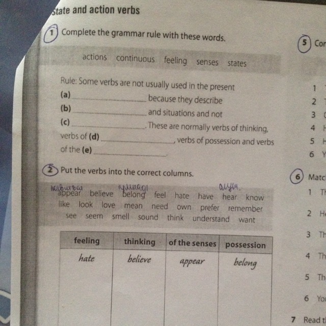 1) feeling - appear, hate, like, love, prefer, need, want.