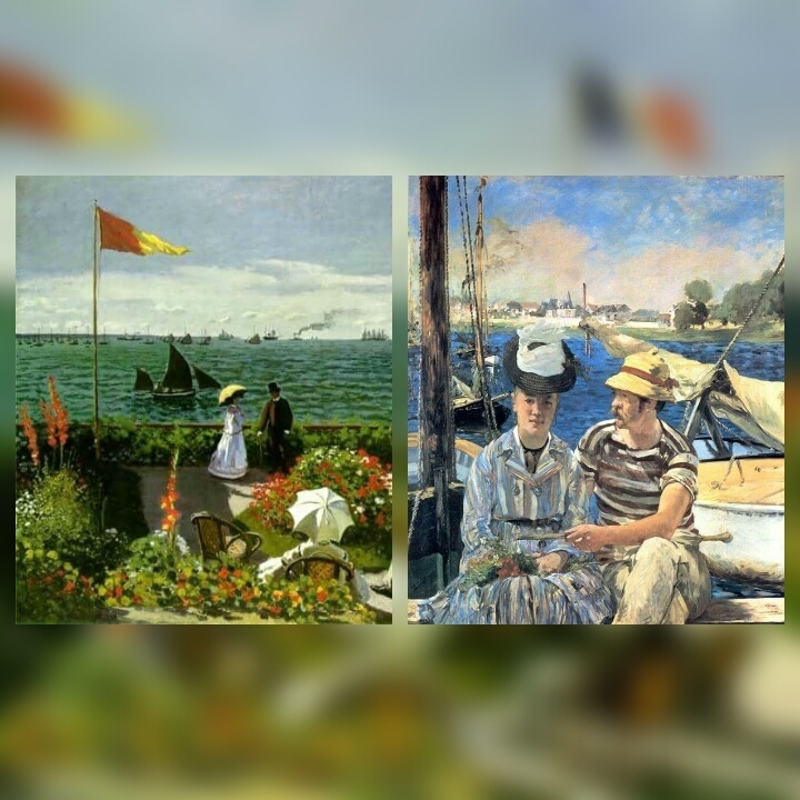 На той и на другой картинах присутствуют корабли. На заднем плане изображение моря, мужчина и женщина, лето, прибой.