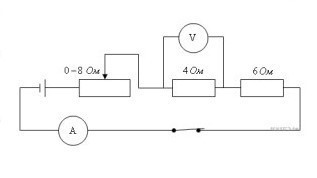 На рисунке представлена электрическая цепь. Вольтметр показывает напряжение 2 В. Какую силу тока показывает амперметр? (Ответ выразите в амперах. Амперметр и вольтметр считайте идеальными.)