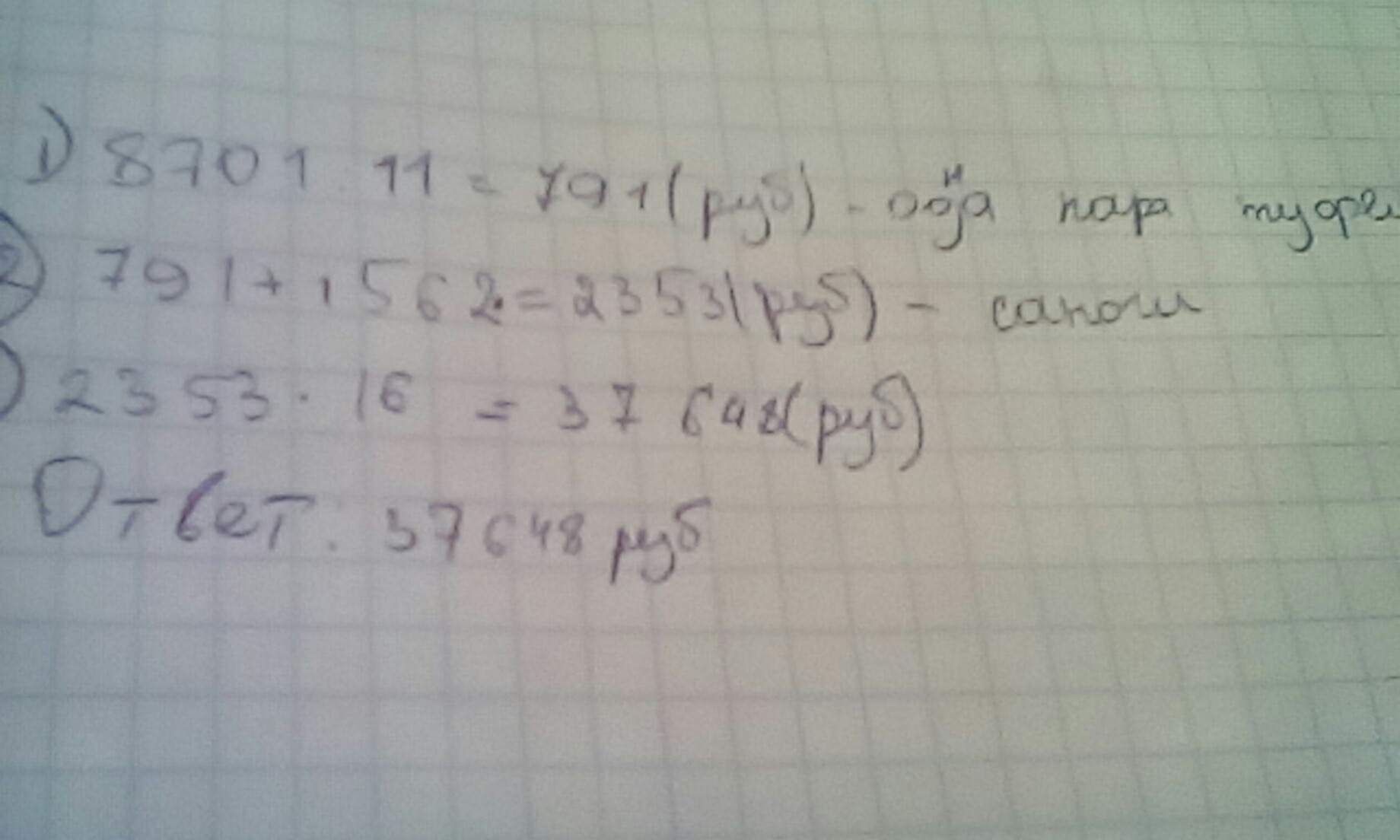 11 пар(-ы) туфель стоят в магазине 8701 рублей. Сколько нужно заплатить за 16 пар(-ы) сапог, если стоимость пары сапог на 1562 рублей дороже, чем пары туфель?