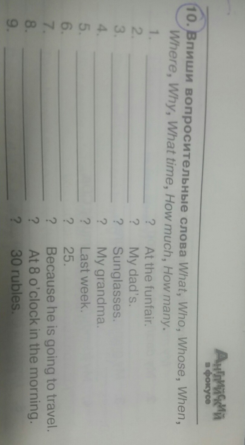 1) where -где 2)whose-чей 3)what-что 4)who-кто 5)when-когда 6) how many - сколько с исчисляемым 7) why- почему 8)what time -во сколько? 9) how much ?- сколько с неисчисляемыми